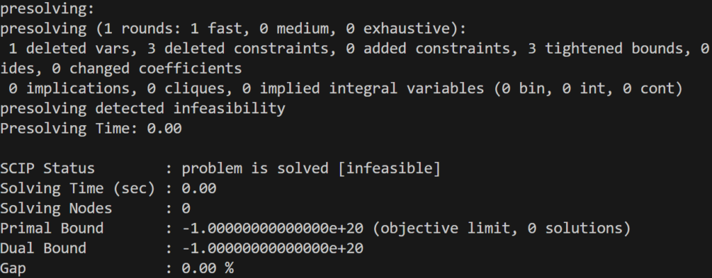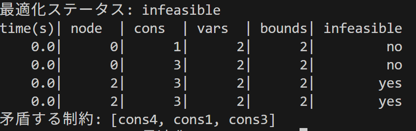 print(f"矛盾する制約: {sub_model.getConss()}")