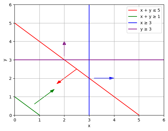 上の4つの制約をすべて満たす \(x,y\) の組は存在しないので、この制約を持つ最適化問題を解くとinfeasibleとなります。じゃあなんでinfeasibleになるのかを考えると、\(x+y \leq 5\)と\(x\geq 3\)と\(y \geq 3\)が矛盾しているからですね。逆に\(x+y \geq 1\)はあってもなくてもinfeasibleなことは変わらないですね。従ってIISは\(x+y \leq 5\)と\(x\geq 3\)と\(y \geq 3\)の3つの制約となります。