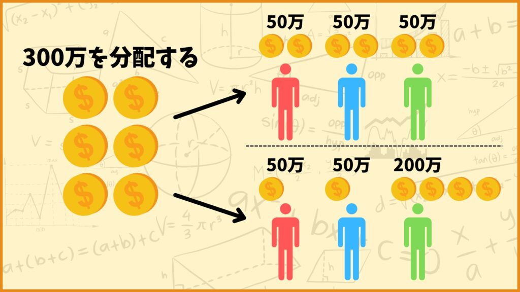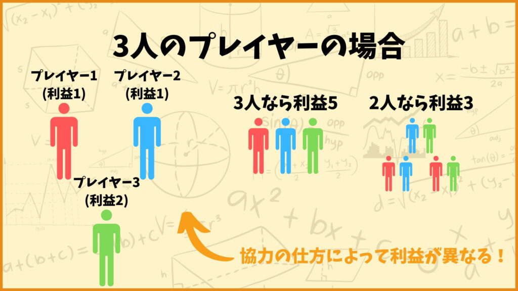 例えば3人のプレイヤーがいて、全員で協力すると300万円の利益が得られるとします。そしたらこの300万円を3人で山分けしないといけないですね。例えば100万、100万、100万に分けたり、200万、50万、50万に分けたり、色々な方法があります。(極端な話300万、0、0も配分方法の1つです。)