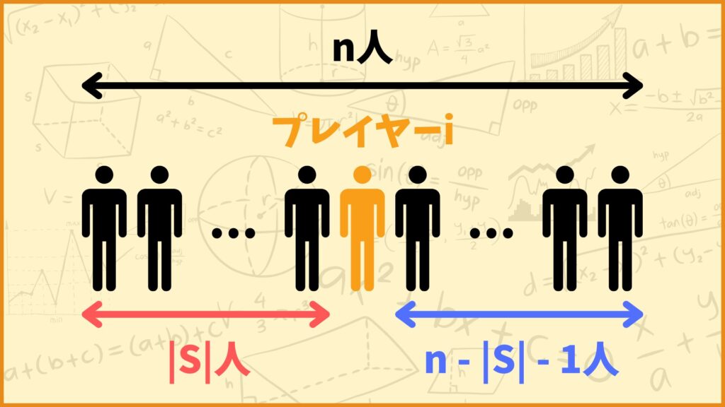 限界貢献度が\(v(S\cup\{i\})-v(S)\)と計算される場合の数が\(|S|!(n-|S|-1)!\)通りある