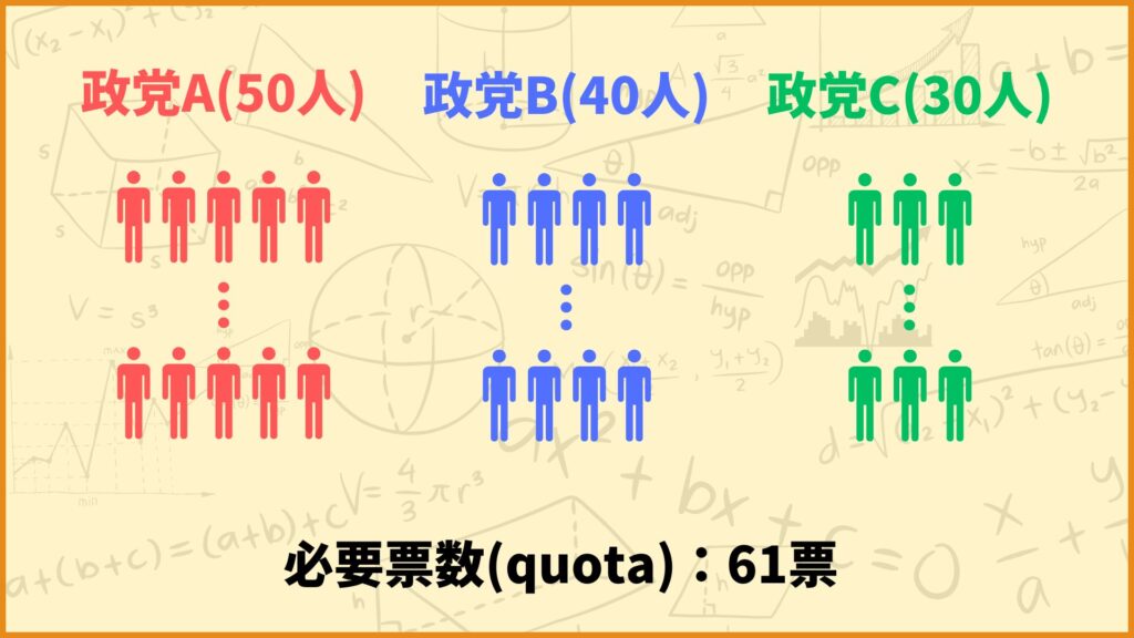 例えば3つの政党1,2,3があり、それぞれが持つ票数が50票、40票、30票、quotaが61票だとします。このとき各文字が表す値は