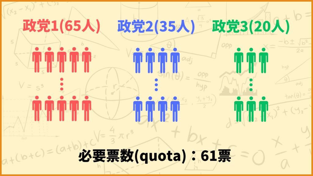 このシチュエーションを分析してみると、政党1だけでquotaを超えていて、政党2,3が協力してもquotaを下回っていますね。すなわち