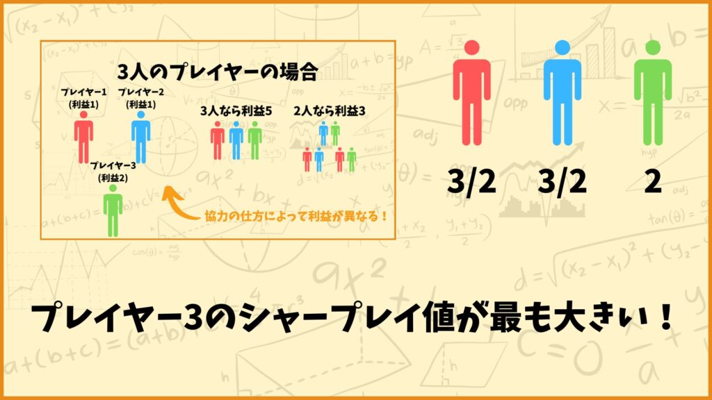 を表しているんです。各プレイヤーのシャープレイ値を見てみると、プレイヤー1,2は3/2、プレイヤー3は2となっており、3人のシャープレイ値の和は